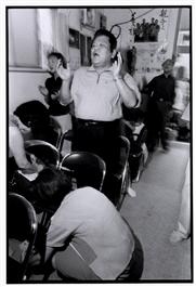 JAPAN. Tokyo. 1999. In debt and under threat, Hiroyuki Suzuki abandoned life as a Yakuza gangster for the brotherhood of Christ. A parishioner praying in the storefront church.