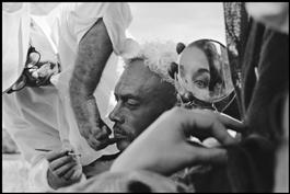 ARGENTINA. 1961. Yul Brynner and C. Kaufmann (in the mirror) during a makeup session on the set of the movie "Tarass Boulba."