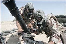 SAUDI ARABIA. October 15th, 1990. US Marines in their desert position wearing gas mask for chemical warfare exercises