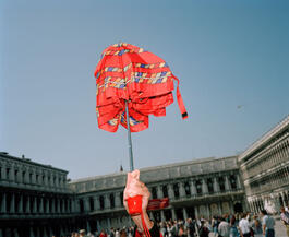 ITALY. Venice. Piazza St. Marco. A tourism guide holds up an umbrella. 1994.