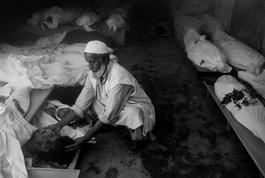 Karachi. Abdul Sattar Edhi has always thought it important to bury people, from whatever background, properly, and has himself washed thousands of corpses according to Muslim rites. Here one of his assistants covers bodies in the mortuary. 1997.