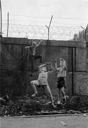 West-Berlin, Germany. Children playing at the Berlin Wall near Bernauer Strasse. The three boys are climbing up the wall and moving along a barbed wire fence alongside the wall hand by hand.