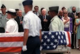 VIETNAM. Hanoi. April 2000. U.S Senator John MCCAIN, his wife, Cindy, and U.S. Ambassador to Vietnam Douglas "Pete" PETERSON at a repatriation ceremony at Noi BAI airport for the remains of soldiers missing in action.