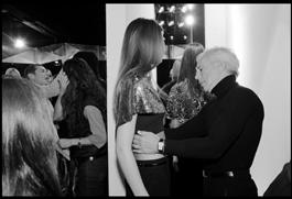 USA. New York City. 2000. Fashion Week. Ralph Lauren checks the fit before sending a model onto the runway.
