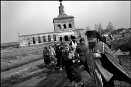 RUSSIA. Krapiviye. 1998. Bishop Feodor of the "Free Orthodox Church" and babushkas pass by the village church, left to ruin by the communist regime.