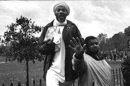 G.B. ENGLAND. London. 1992. Threatening Muslims. "No picture" said the tough looking muslim protecting his Imam at London's Speakers Corner in Hyde Park, refusing to say what group or sect he belonged to. When pressed to say the reason why, he offered to beat up the photographer. New converts to any religion are usually the ones more paranoiac about their faith. Muslims of Gujerati Indian origin believe that various hadiths (sayings) by the prophet forbid representation of the human face, and authorise only photography from the back.