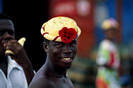 HAITI, Port au Prince, 1991. Colombus legacy. Man with funny hat in Cite Soleil slum.