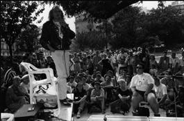 FRANCE. Paris. 1997. Father Guy GILBERT who prides himself to attending to petty criminels addresses youth outside the church of Trinité.