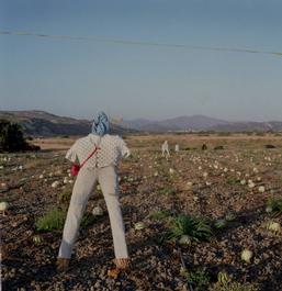 Greece. Rhodes. Apolakia. A scarecrow on a field of melons.