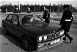 The Baltic States. Latvian customs police check a car crossing what the Latvians consider the national border. Baltic states' customs police have are more symbolic than effective.1991.