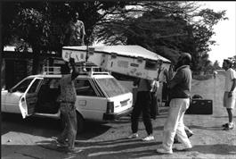 The French bassist Henri TEXIER (on the right) loading his bass on the top of the car. Tuesday 27th February, 1990.