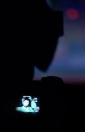 Japan. Kyoto. Maiko-san watches the Spring Maiko-odori dance in Gion and videos it.