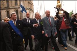 FRANCE. Paris. May Day. 1st arrondissement. 2000. The National Front right-wing extremist president Jean Marie Le Pen, accompanied by Charles De Gaulle's grandson at his left, leads the "Joan of Arc's Day" rally along Rue de Rivoli towards the Garnier Opera Square.