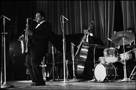 From left to right the Americans saxophonist John COLTRANE, bassist Jimmy GARRISSON and drummer Elvin JONES performing in John Coltrane Quartet with the American Mac Coy TYNER (p). Wednesday 28th July, 1965.