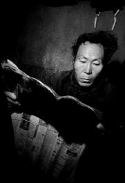 2000. Homeless man reads his newspaper.