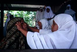 Asia. Indonesia. Sumatra. Aceh Province. Muslim girls prepare...