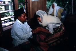 Asia. Indonesia. Sumatra. Aceh Province. Woman pays respects to Imam after prayers.