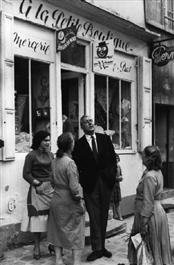 FRANCE. Val-de-Marne. St-Maur-des-Fosses. 1958. French movie direcor, Jacques TATI, talking to some inhabitants. His film "Mon oncle" (My Uncle) takes place in this town.