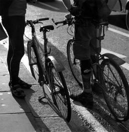 GB. London. The City, financial district. Two bicycles and legs of couriers.