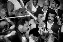ZAIRE. Kinshasa. Muhammad Ali talking with the press in his dressing room, after the fight he won. On his right is his brother Rachaman. 1974.