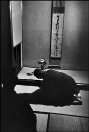 JAPAN. Town of Kyoto. In the "tokonoma", an alcove in the house's main room, devoted to the displaying of a painting and a bunch of flowers. The man has put himself in a crouching position to get a better view of the effect produced. 1951.