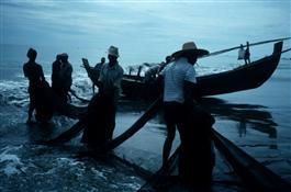 Asia. Indonesia. Sumatra. Aceh Province. Fishermen bringing in nets at dawn.