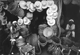 Marocco, Marrakesh: Venditore di oggetti di paglia nel suk.