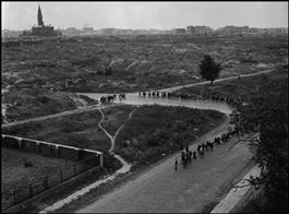 Schoolchildren walking home through the ruins of the Warsaw Ghetto. The church in the background was the only building not destroyed.
