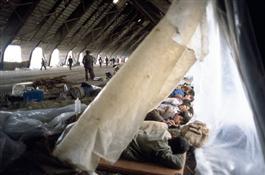 Albanian refugees sleep on the docks.