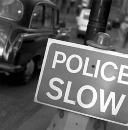 GB. London. The City, financial district. Police Slow sign with taxi.