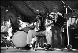 From left to right, the french jazz musicans Yves CARBONNE (gb), Alban LUBAT (dm), Bernard LUBAT (p,dm,acc), Jean PASCUAL (acc), André LASSALLE (acc) Thursday 17 August 1989