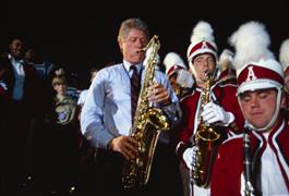 Arkansas, USA. Bill Clinton plays the saxophone with Razorback...
