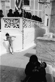 GREECE. Olimpos. People standing outside the church waiting for...