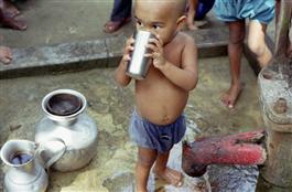 BANGLADESH. Jhikargachha. Krishnanagur District. Toddler drinks water from a red-painted well indicating that the water is contaminated with arsenic. The village has no other source of pure water. 2000.