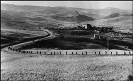 ITALY. Near Troina, Sicily. August, 1943. American troops march toward Troina, located on the main road to Messina (Sicily's main port to the mainland). The town was being fiercely defended by the Germans, in an attempt to evacuate all German troops.