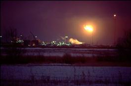 Kazakhstan. Prikaspiyskaya. Aksai. Gas plant at night with flame from towers in minus 30C temperature.