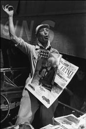 A newspaper vendor draws buyers on the latest results of the 'tour'.