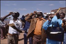 KENYA. 1980. Sun total eclipse. People in the village of Voi, looking at the eclipse through smoked glass protection.