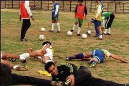 IRAN. Tehran. 1998. National team star player Alireza MANSOURIAN training with Esteghlal team.