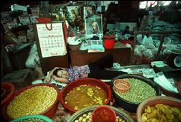 THAILAND. Bangkok. Markets along Sukhumvit Road, merchant resting. 1994.