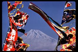 JAPAN. Izu Peninsula. 1961. Flags in fishing village with Mount Fuji in the background.