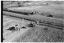GERMANY, WEST BERLIN,1961. Farmers work on west side of barbed wire while soldiers build earthworks on the East.