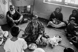 Karachi. Abdul Sattar Edhi's wife, Bilquis, plays a crucial role in running the homes for destitute women. Here in Quetta she shares fruit with them and their children. 1997.