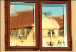 Copenhagen,window reflections of old houses along waterfront...