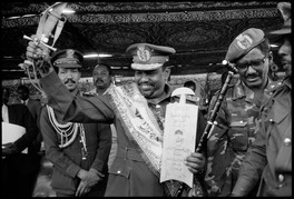 SUDAN. Khartoum. February 1993. At a political rallye, Lieutenant General Omar Hassan AL BASHIR, chairman of the Revolution Command Council, holds a sword in right hand, and koranic surates in the other one, symbols of the islamist army.