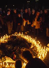 G.B. ENGLAND. London. Funeral of Princess Diana.Mourners keep candlelight vigil at Buckingham Palace 1997.