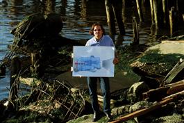 USA. New York City. 1998. Artist Thom MERRICK holds up a drawing of a giant balloon monster on the Brooklyn waterfront.