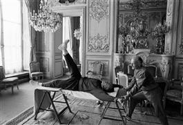 Paris. Prime Minister Jacques CHABAN- DELMAS warming up in his office at the National Assembly with his gymnastic professor.