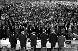 Karlsruhe.The convention of Germany's neo Nazi party, the delegates stand after singing the 'Horst Wessel Lied' the song of the Nazis.Boyish and playful, some delegates wear old Nazi symbols inside their jackets.