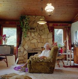 GB. London. Twickenham. Eel Pie Island on the River Thames. Gladys HEATH, at the age of 81 the island's longest resident. She lives in a Scandinavian kit home bought in the fifties and delivered to the island by barge from Tilbury Docks.